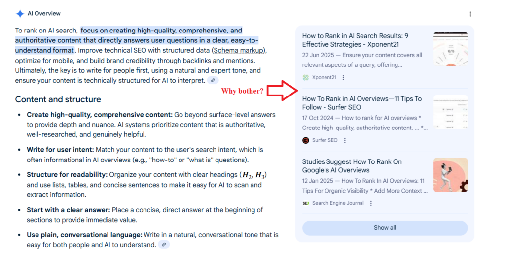 That’s what makes modern AI and SEO so tricky. It’s no longer “write good content, get backlinks, climb the ranks.” It’s “teach multiple AIs to trust you.”