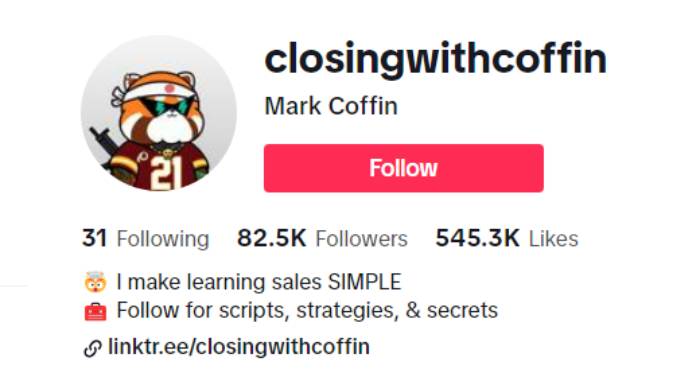 Mark Coffin, also known as @closingwithcoffin on TikTok, is a sales enthusiast with a substantial online following. With 82.5K followers and 545.3K likes, Mark is dedicated to simplifying the art of sales. His TikTok profile showcases a variety of content, including scripts, strategies, and secrets to help others excel in the world of sales.