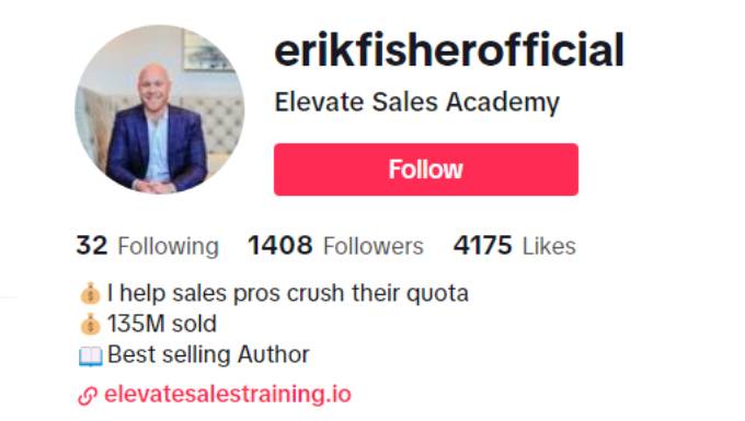 Erik Fisher, operating under the handle @erikfisherofficial on TikTok, is the driving force behind Elevate Sales Academy. With a substantial online presence boasting 1.4K followers and 4.2K likes, Erik positions himself as an expert in the field of sales, leveraging his experience in helping sales professionals exceed their quotas.